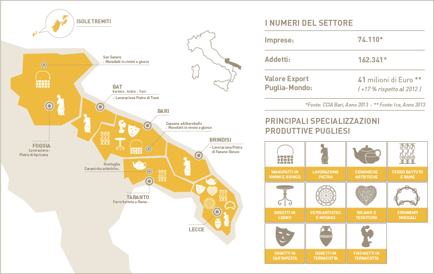Ceramica, cartapesta, ricami, strumenti musicali, ferro battuto, vetri e mosaici sono solo alcune delle produzioni artigianali pugliesi; un universo vitale che rappresenta una risorsa culturale, turistica, occupazionale e creativa di grande rilievo.