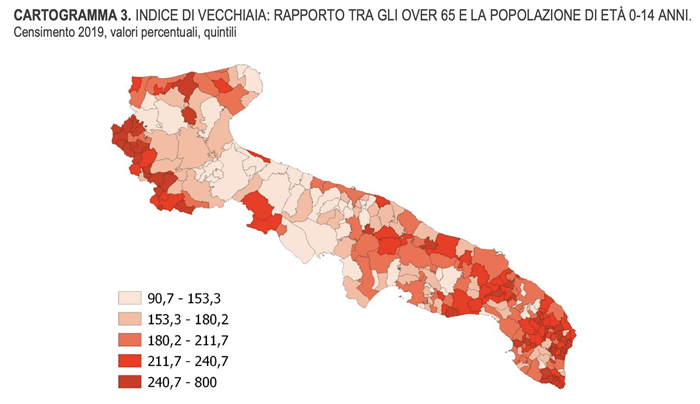 • l’indice di vecchiaia (che è dato dal rapporto tra la popolazione oltre i 65 anni e la popolazione inferiore a 14 anni) risulta disomogeneo sul territorio e molto alto, in particolare nella zona del Salento e del sub-appenino dauno;