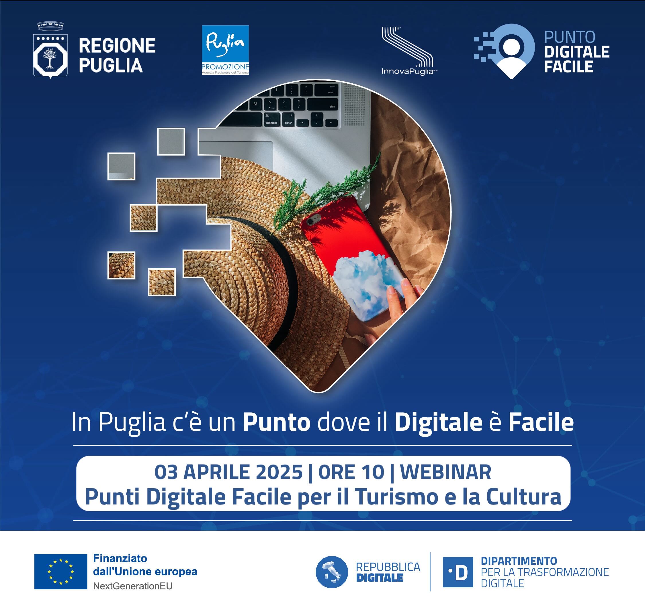 La Regione Puglia, in collaborazione con l’Agenzia Regione del Turismo Pugliapromozione e con InnovaPuglia Spa, organizza il webinar formativo “Punti Digitale Facile per il Turismo e la Cultura", che si terrà sulla piattaforma Google Meet giovedì 3 aprile, dalle ore 10 fino alle 13.