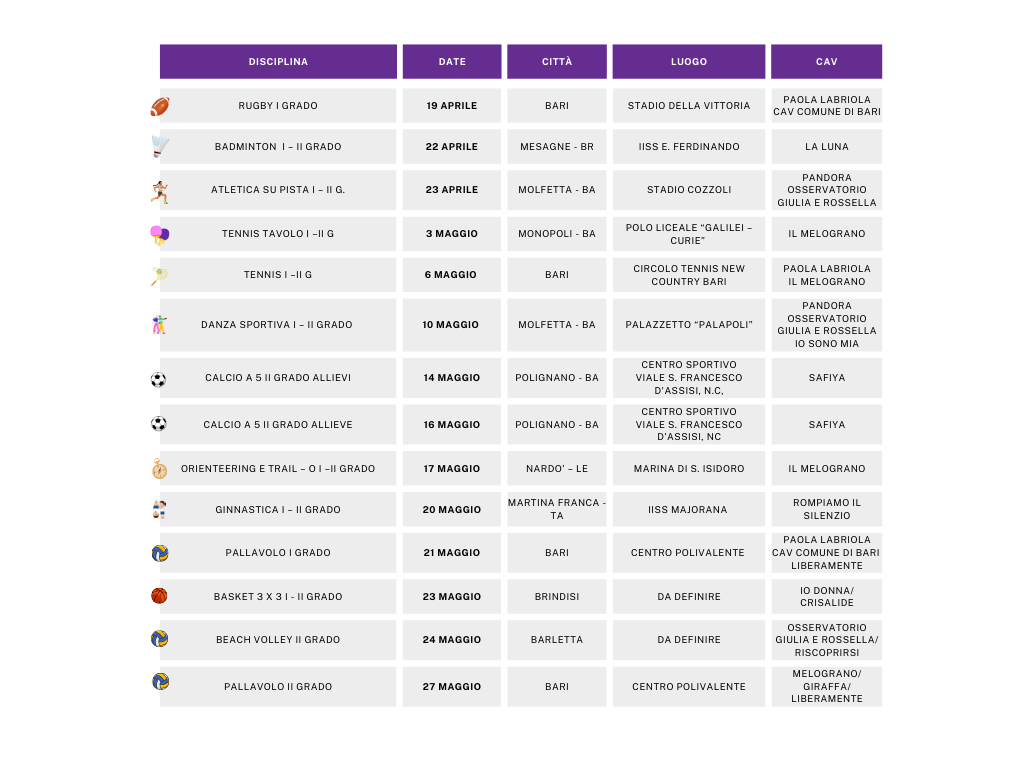 Informazioni e foto degli eventi organizzati dall'Ufficio Scolastico regionale Puglia e da Sport e Salute spa aderenti alla campagna "Allénati contro la violenza" -