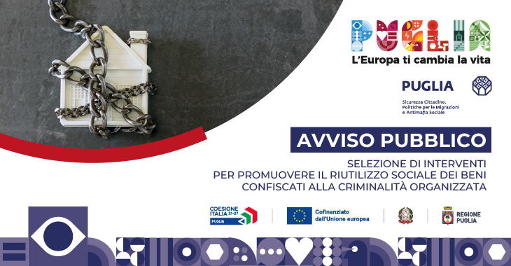 Con determinazione del Dirigente della Sezione Sicurezza Cittadino, Politiche per le Migrazioni, Antimafia Sociale n. 33 del 26 marzo 2025 e n. 34 del 31 marzo 2025, pubblicate sul BURP (Bollettino Ufficiale della Regione Puglia) n° 27 del 03/04/2025, è stato approvato l’Avviso Pubblico PR Puglia 2021-2027 –Priorità 8 “Welfare e Salute” - Azione 8.2 “Interventi finalizzati a promuovere la qualità dell’abitare e l’accesso ai servizi” - Sub-Azione 8.2.2. “Riuso di beni immobili, compresi beni confiscati alla criminalità organizzata, e/o terreni se strettamente funzionali e connessi ad una struttura utile a creare spazi di comunità” - PUGLIA BENI COMUNI - Avviso Pubblico per la selezione di interventi finalizzati a promuovere il riutilizzo sociale dei beni confiscati alla criminalità organizzata.