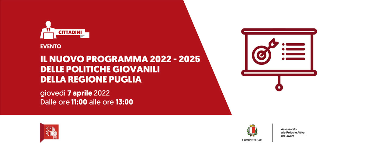 L’incontro sarà aperto da Eugenio Di Sciascio, Vice Sindaco ed Assessore alle Politiche attive del Lavoro del Comune di Bari, insieme a Paola Romano, Assessore comunale alle Politiche Giovanili, ed a Mina Bonante, funzionario responsabile del Job Centre Porta Futuro Bari. Alessandro Delli Noci, Assessore regionale alle Politiche Giovanili, con il supporto dello staff regionale presenterà il Programma.