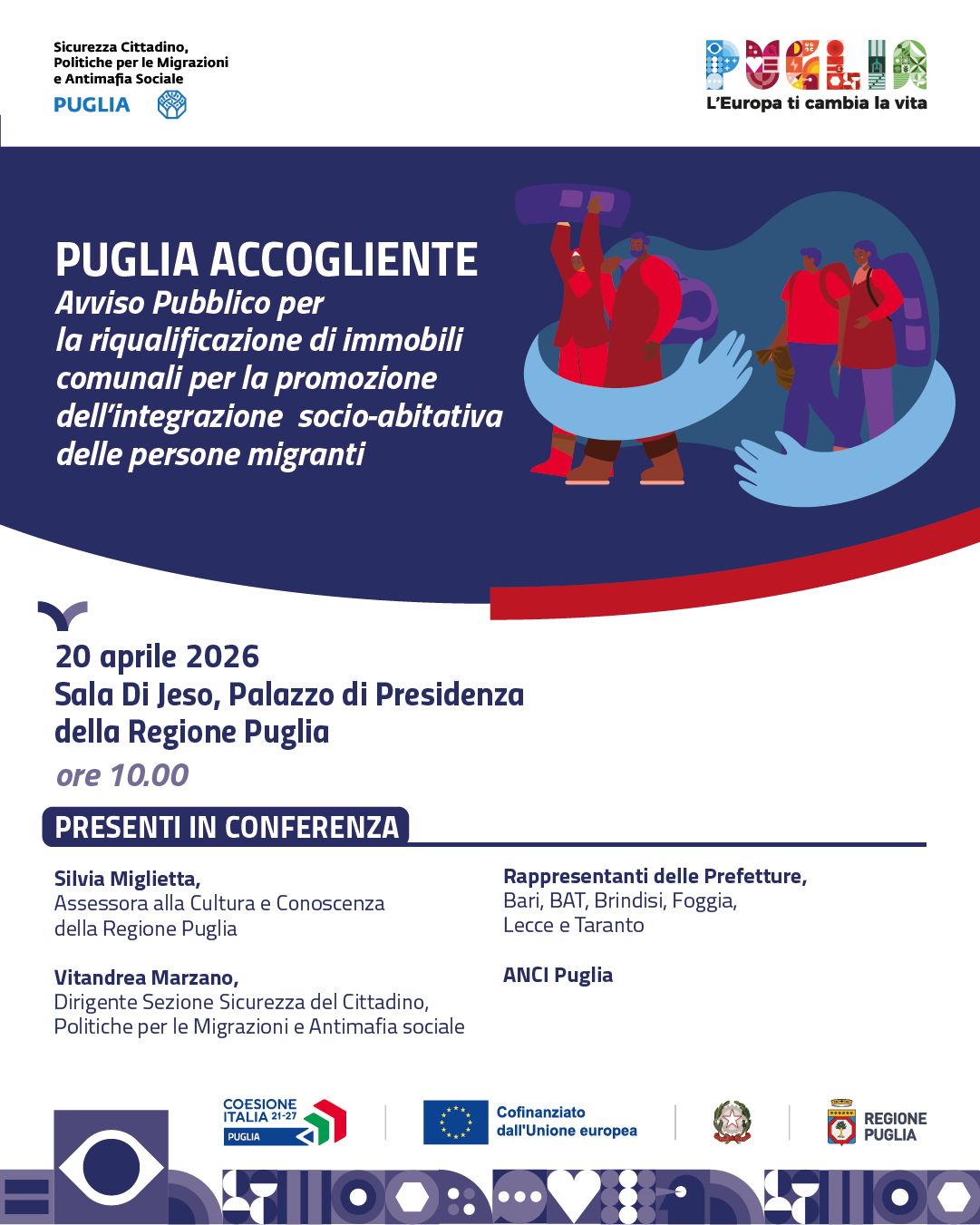 Lunedì 20 aprile, alle ore 10, nella Sala Di Jeso del Palazzo di Presidenza della Regione Puglia (Lungomare Nazario Sauro n. 33 – Bari) si terrà la conferenza stampa di presentazione dell’Avviso pubblico Puglia Accogliente, finalizzato alla selezione di interventi per la riqualificazione di immobili comunali volti a promuovere l'integrazione socio-abitativa delle persone migranti regolari.