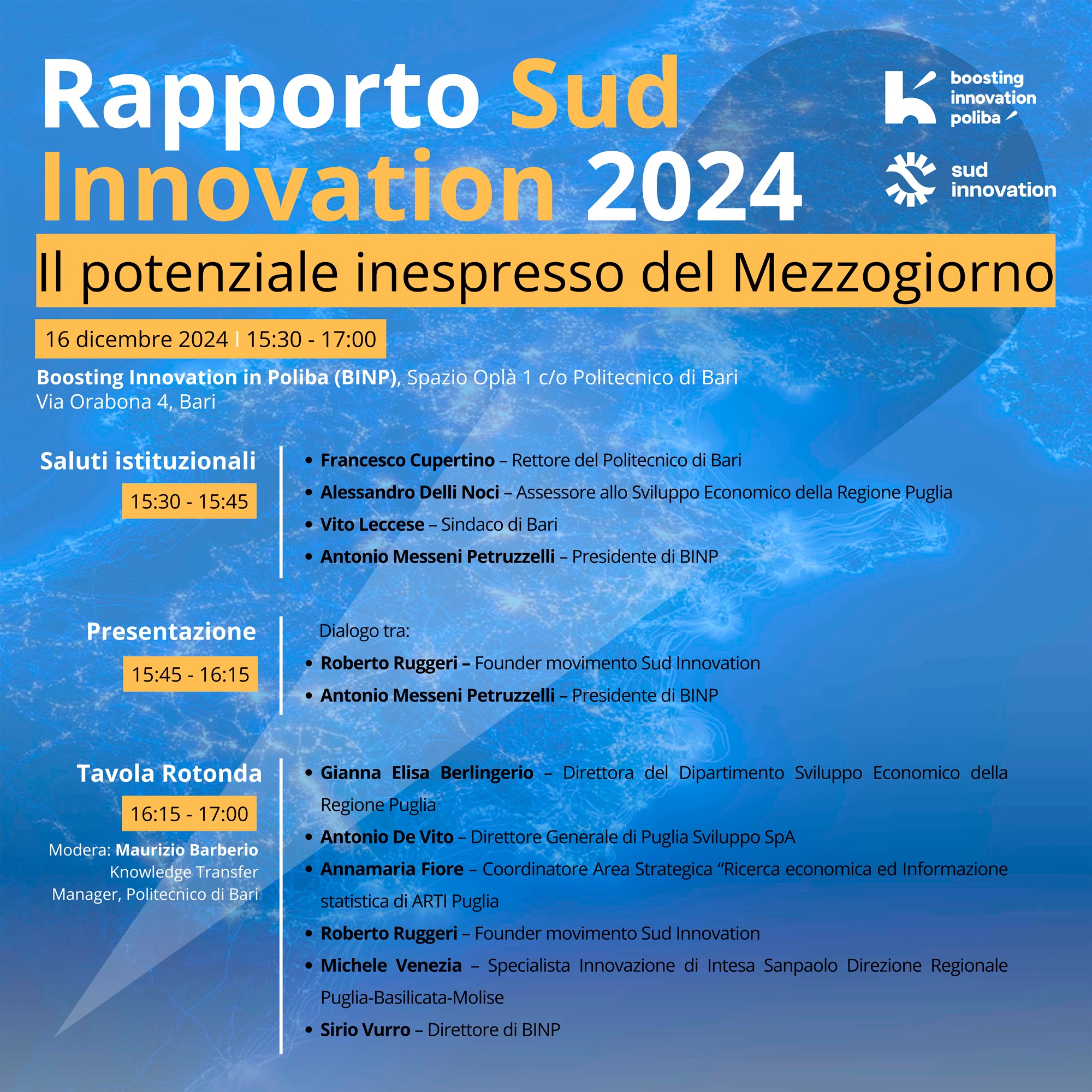 Si terrà lunedì 16 dicembre dalle 15:30 alle 17:00 presso la sede di BINP (Boosting Innovation in Poliba), incubatore promosso dal Politecnico di Bari e partecipato da ANCE Bari-BAT e Confindustria Bari-BAT(Spazio Oplà 1, Via Orabona 4, Bari)l’evento di presentazione del "Rapporto Sud Innovation 2024 - Il potenziale inespresso del mezzogiorno", che vede anche un approfondimento sulle dinamiche di innovazione che caratterizzano la regione Puglia.