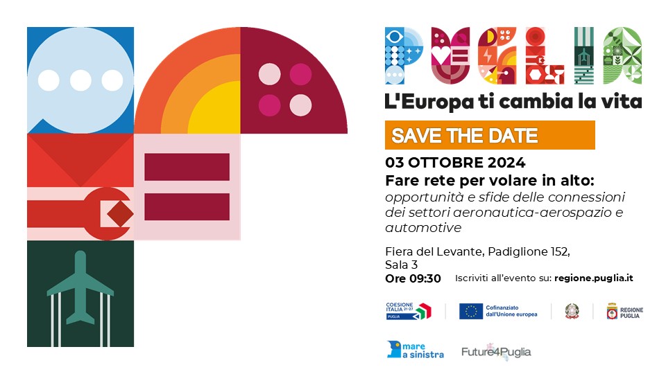 Giovedì 3 ottobre (ore 10-13), a Bari in Fiera del Levante, presso il Padiglione istituzionale della Regione Puglia, nel corso dell’87° Fiera Campionaria Internazionale, si terrà il seminario “Fare rete per volare in alto: opportunità e sfide delle connessioni dei settori aeronautica-aerospazio e automotive”.