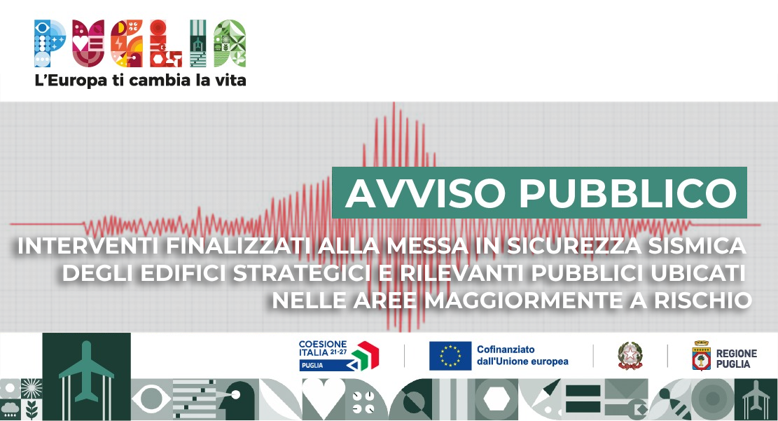 Con Determinazione del Dirigente della Sezione Difesa del suolo e rischio sismico n. 143 del 12 novembre 2024, pubblicata sul Bollettino Ufficiale della Regione Puglia n. 94 del 12 novembre 2024, è stato approvato l’Avviso pubblico PR Puglia FESR-FSE+ 2021-2027 - Asse Prioritario II “Economia verde” - Azione 2.5 “Interventi per la prevenzione dei rischi e l’adattamento climatico” - sub-Azione 2.5.2 “Messa in sicurezza sismica degli edifici strategici e rilevanti pubblici ubicati nelle aree maggiormente a rischio”.