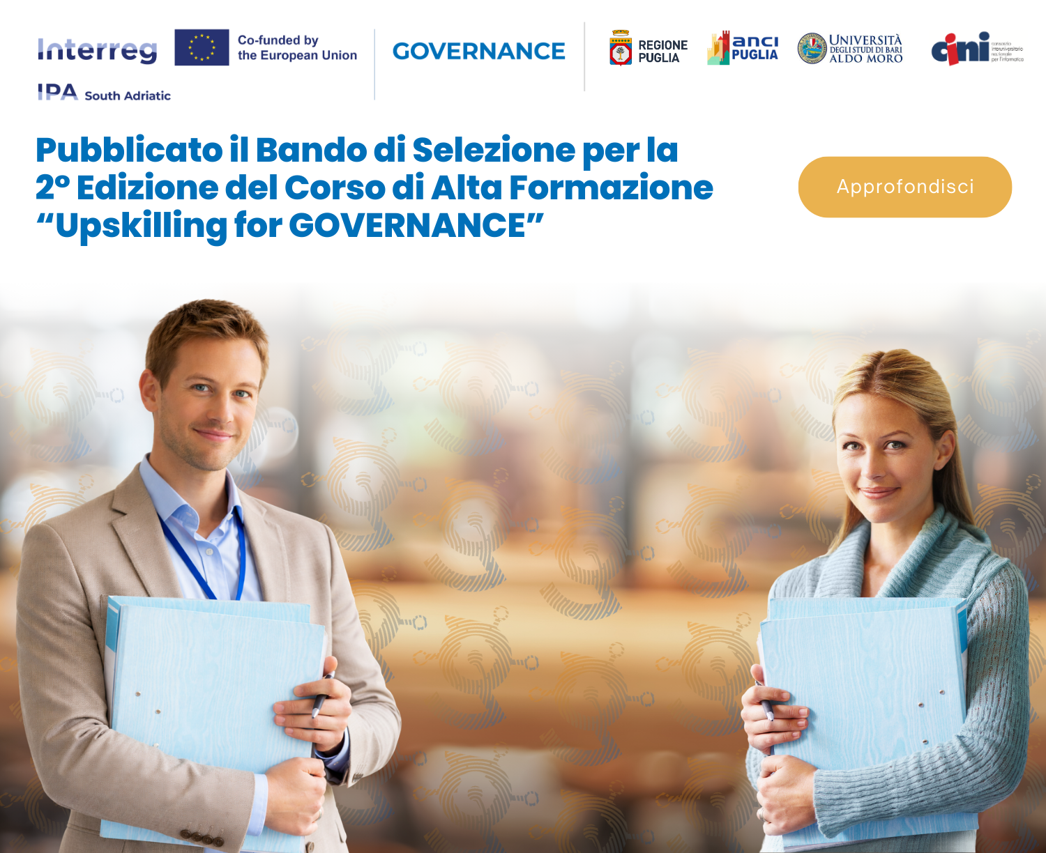 La Regione Puglia, in collaborazione con ANCI Puglia, l’Università degli Studi di Bari “Aldo Moro” e il Consorzio Interuniversitario Nazionale per l’Informatica – CINI, dà il via alla seconda edizione del Corso “Upskilling for Governance”, rivolto ai dipendenti dei Comuni pugliesi. Questo percorso gratuito di alta formazione, realizzato nell'ambito del progetto strategico Interreg GOVERNANCE (cofinanziato dal Programma Interreg IPA South Adriatic 2021–2027 Italia-Albania-Montenegro), rappresenta una pietra miliare nel rafforzamento delle competenze digitali e amministrative nella Pubblica Amministrazione locale.