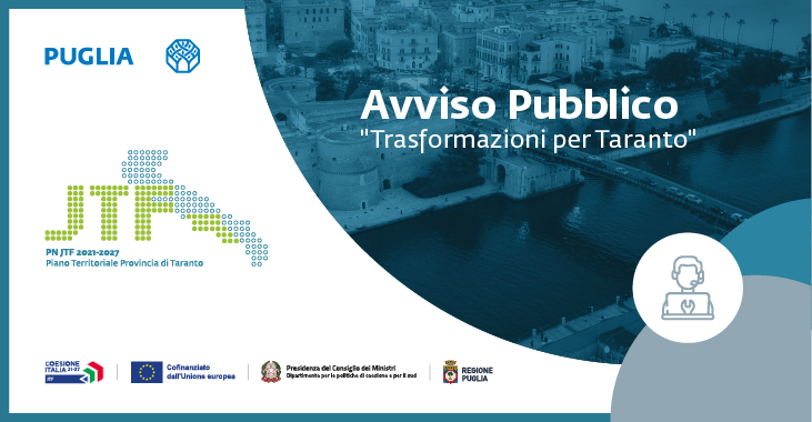 Con determinazione dirigenziale della Sezione Crescita digitale delle persone, del territorio e delle imprese n. 324 del 25/09/2025, pubblicata sul BURP n. 79 del 2 ottobre 2025 è stato approvato l'avviso pubblico "Trasformazioni per Taranto" nell'ambito del PN JTF ITALIA 2021-2027. Piano Territoriale di Taranto. Azione 2.5 – Procedura 2.5.1 Interventi di supporto ai processi di innovazione e diversificazione del tessuto economico-produttivo”