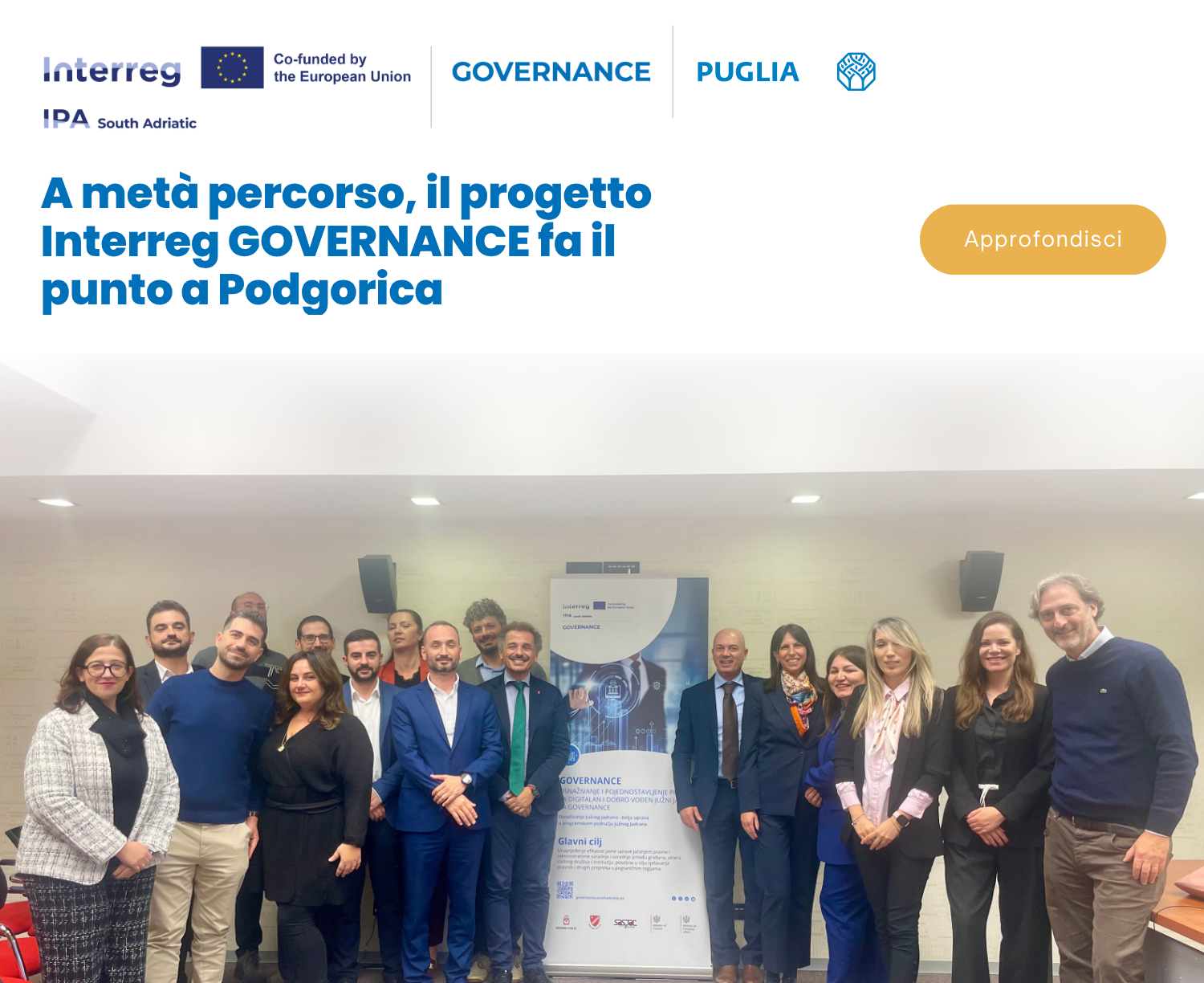 Dal 17 al 19 novembre 2025 a Podgorica Dal 17 al 19 novembre 2025 a Podgorica il partenariato si è riunito in occasione della valutazione intermedia del progetto Interreg GOVERNANCE. Tre giornate di confronto tra Italia, Albania e Montenegro per condividere risultati, esperienze e prossime sfide verso una Pubblica Amministrazione più digitale, semplice e vicina ai cittadini