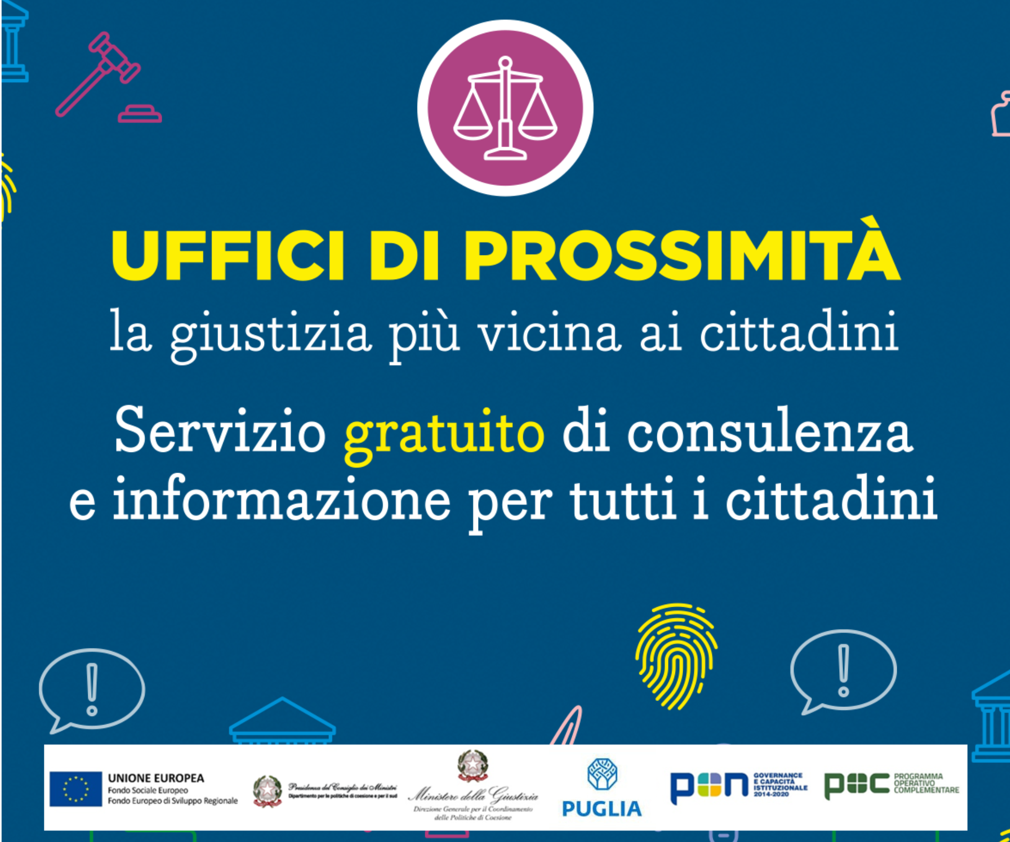 Il progetto “Uffici di Prossimità” è promosso dal Ministero della Giustizia e finanziato nell’ambito del Piano Operativo Complementare (POC) al PON Governance e Capacità Istituzionale 2014–2020Asse 1, Obiettivo specifico 1.2, Azione 1.2.2. La Regione Puglia svolge un ruolo di coordinamento e supporto tecnico-amministrativo, favorendo il dialogo tra i soggetti istituzionali coinvolti e accompagnando il consolidamento degli Uffici di Prossimità sul territorio regionale anche mediante l’acquisto di dotazioni tecnologiche e arredi, nonché attraverso l’attivazione di percorsi formativi rivolti al personale comunale.